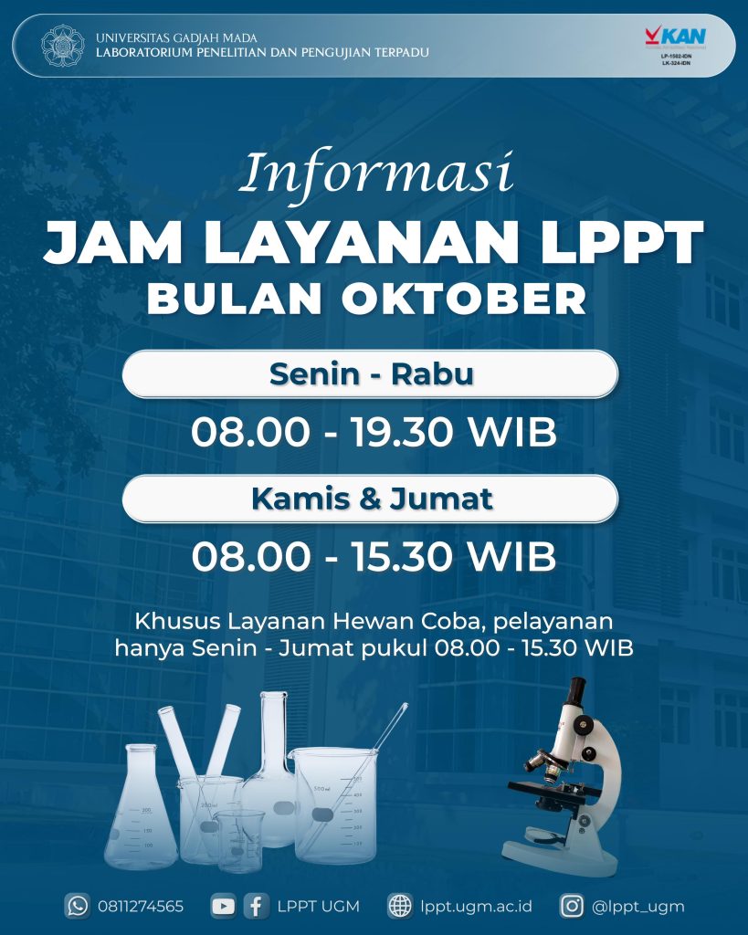 Selama bulan Oktober, LPPT UGM memperpanjang jam layanan pada hari Senin, Selasa, dan Rabu hingga pukul 19.30 WIB! 💡