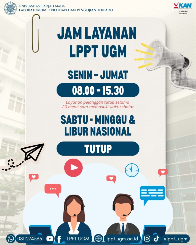 Diberitahukan kepada Pelanggan LPPT UGM, dalam rangka Libur Nasional dan Cuti Bersama Hari Raya Nyepi dan Hari Raya Idul Fitri 2026, layanan diatur sebagai berikut: